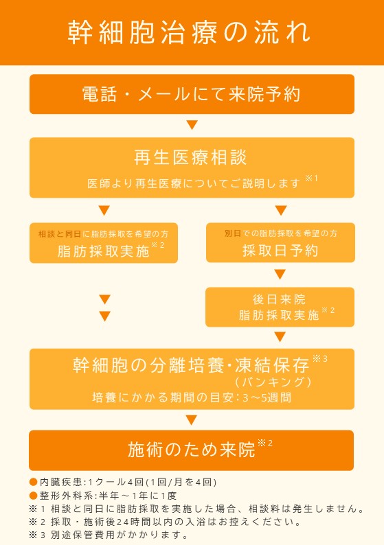 PRP治療と幹細胞治療のおおまかな流れは下記の通りです。